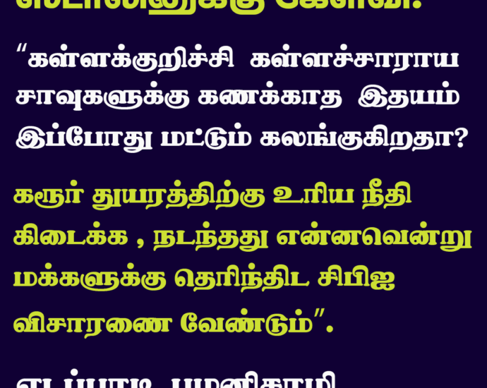 கள்ளக்குறிச்சி கள்ளச்சாராய சாவுகளுக்கு கணக்காத இதயம் இப்போது மட்டும் கலங்குகிறதா? 2025-09-29 By: dinakuzal On: September 29, 2025 In: தமிழ்நாடு With: 0 Comments Continue Reading
