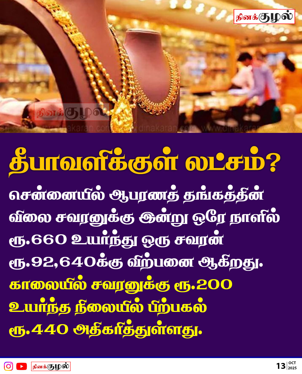• சென்னையில் ஆபரணத் தங்கத்தின் சவரனுக்கு இன்று ஒரே நாளில் ரூ.660 உயர்ந்து ஒரு சவரன் ரூ.92,640க்கு விற்பனை ஆகிறது.